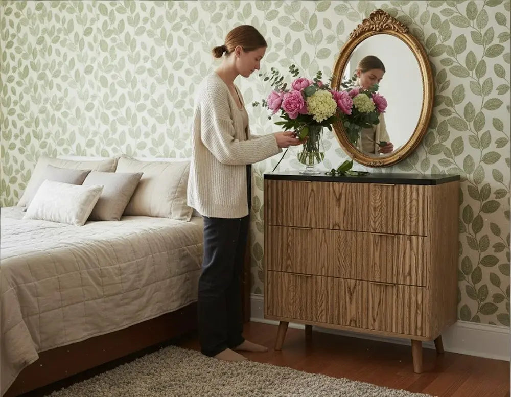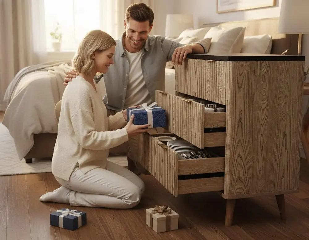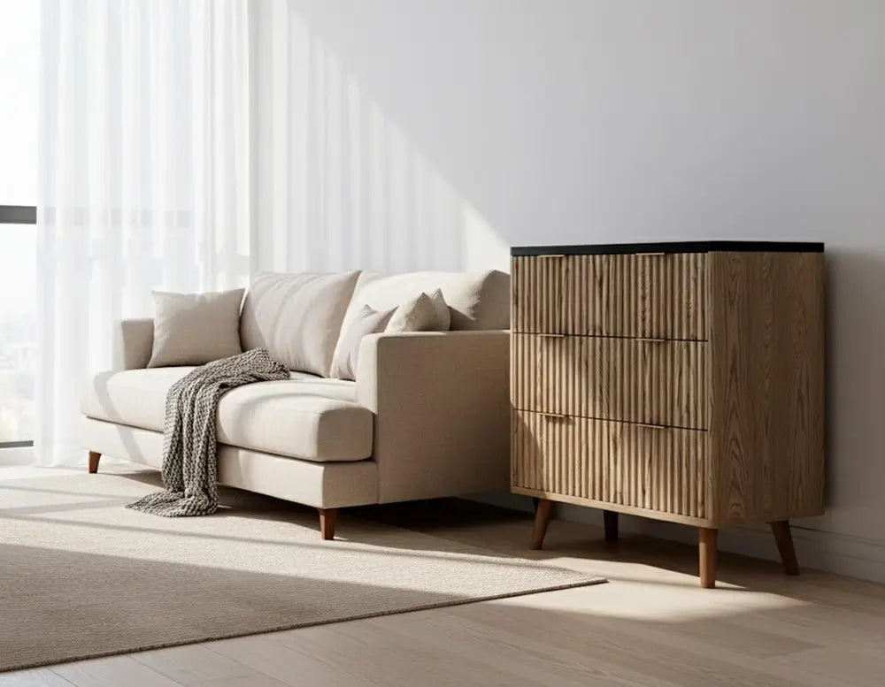 Consola decorativa de madera maciza de roble y negro de 32" con tres cajones