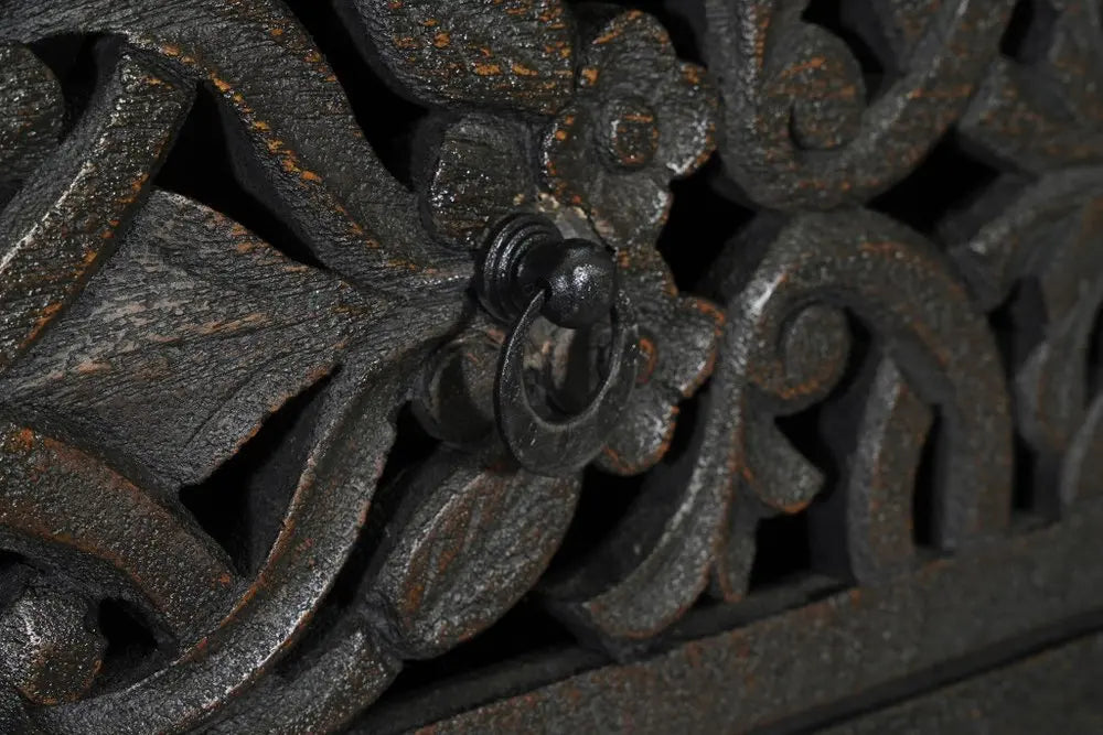 Cómoda de madera maciza de seis cajones con diseño floral tallado en negro de 35"