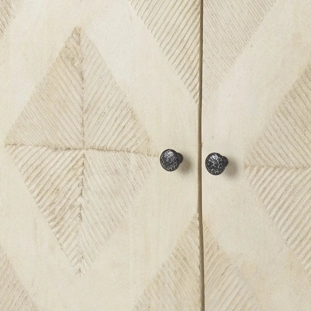 Gabinete de 36" con detalles geométricos tallados en madera maciza y hierro color crema y gris, con dos puertas