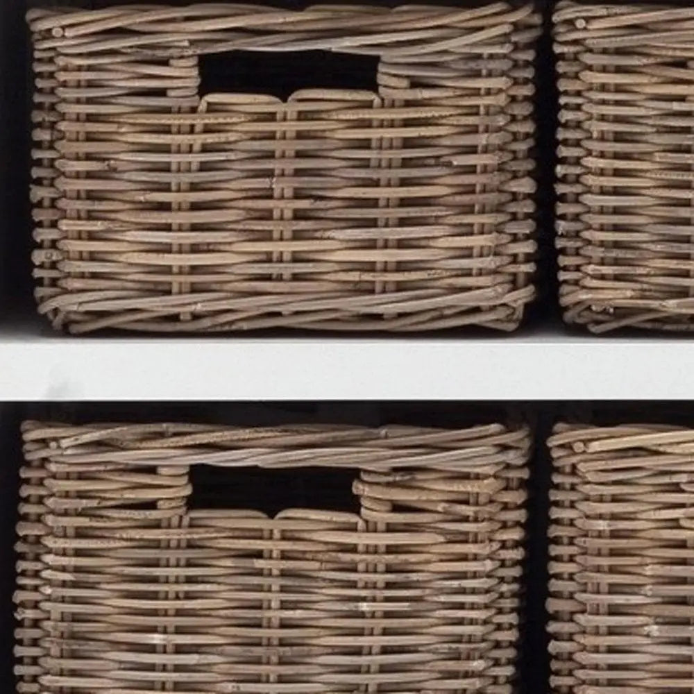 Librería de madera blanca de 87" con puertas de cristal, cajones y cestas.