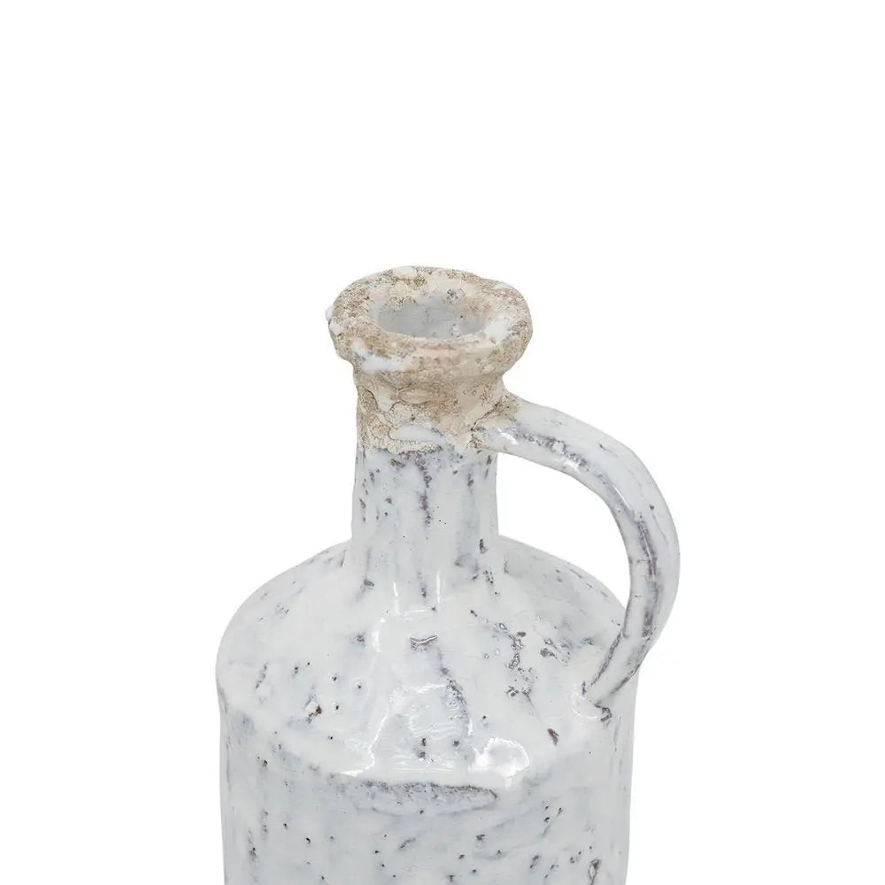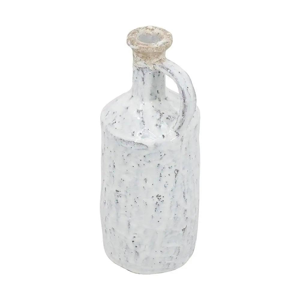 Add a touch of elegance to your home decor with this 11-inch ivory terracotta round jug vase. Crafted from terracotta, this jug vase features a round shape and a transitional style that complements any interior. Hand-painted in a beautiful ivory color, this vase adds a subtle pop of color to your space. The purposeful distressing with coat/paint distressing technique gives it a unique and artful look that will enhance the charm of any room. Ideal for showcasing your favorite blooms or as a standalone decorative piece, this vase is a versatile addition to your living space. 11-inch h x 4.9-inch w x 4.5-inch d.