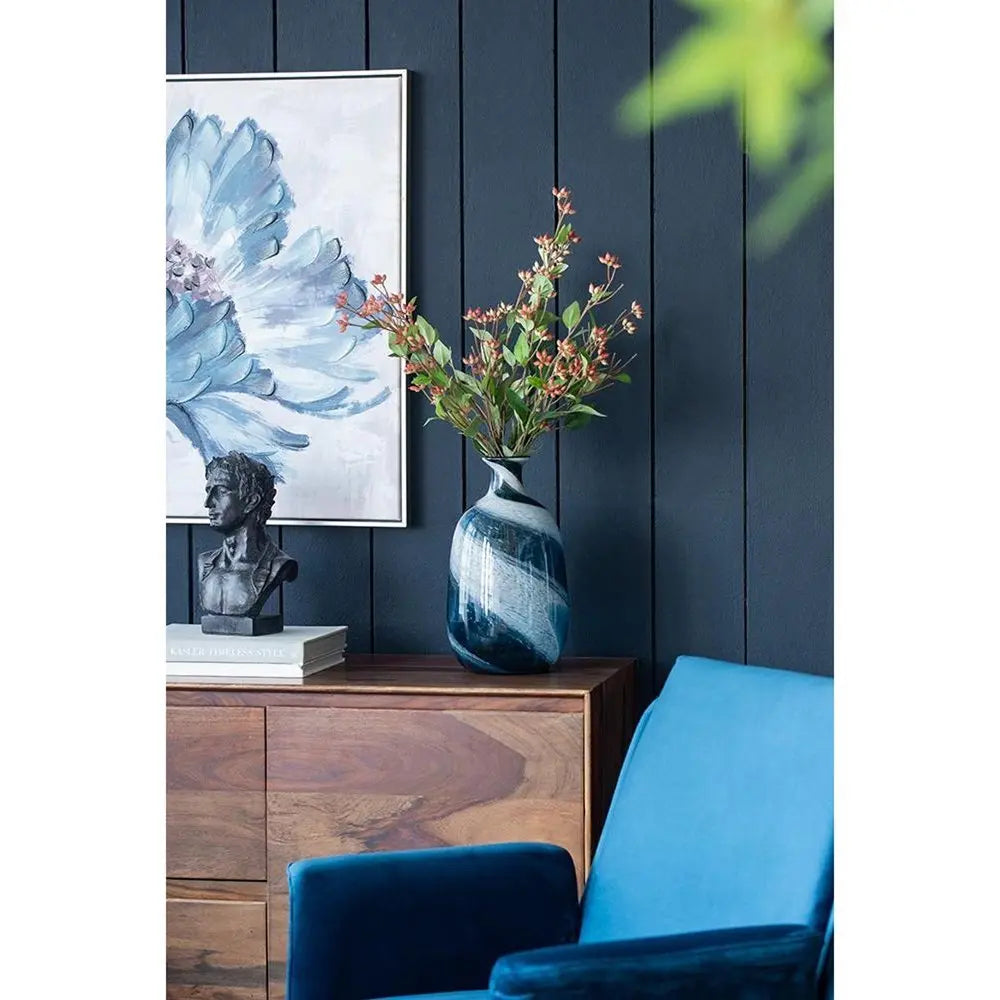 13" Blue And White Striped Swirl Art Glass Table Vase