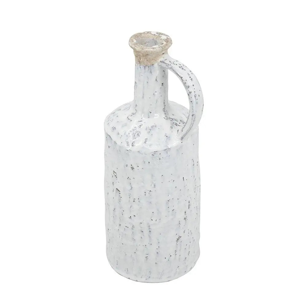 Add a touch of elegance to your space with this 13-inch jug vase crafted from terracotta in a round shape. Featuring a beautiful ivory color and hand-painted details, this transitional style vase brings a sense of warmth and character to any room. The purposeful distressing with a coat/paint technique adds a unique charm, making it a perfect accent piece for your home decor. 12.8-inch h x 5.3-inch w x 4.9-inch d.