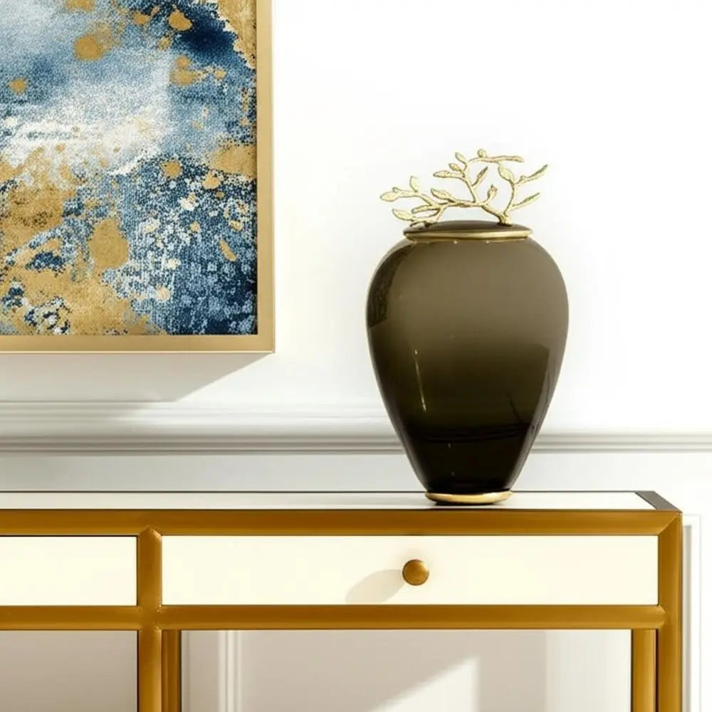 Elevate your space with the 14-inch dark green and gold glass and metal round ginger jar, a stylish addition to your contemporary decor. Popular with interior designers, the ginger jar is a timeless and versatile statement piece that can be used as a vase, table centerpiece, storage vessel, or general decorative accent. Inspired by old world design, this regal accent add a touch of nature to your space and will add chic artistic flair to your living room, bedroom, entryway or dining area. Crafted from high quality glass and metal, this exquisite lidded jar exudes sophistication and timeless beauty. 13.50-inch h x 8.00-inch w x 8.00-inch d.