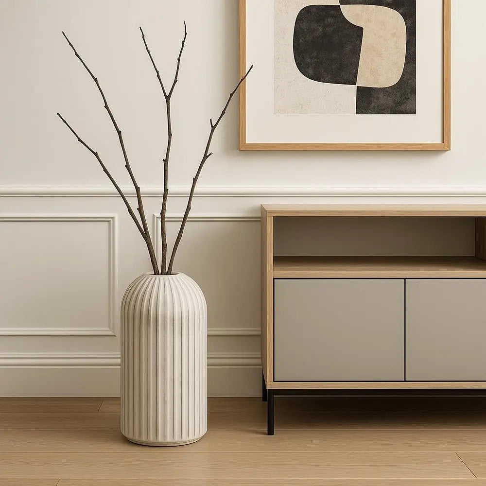16" Gray And White Striped Cylinder Ceramic Floor Vase