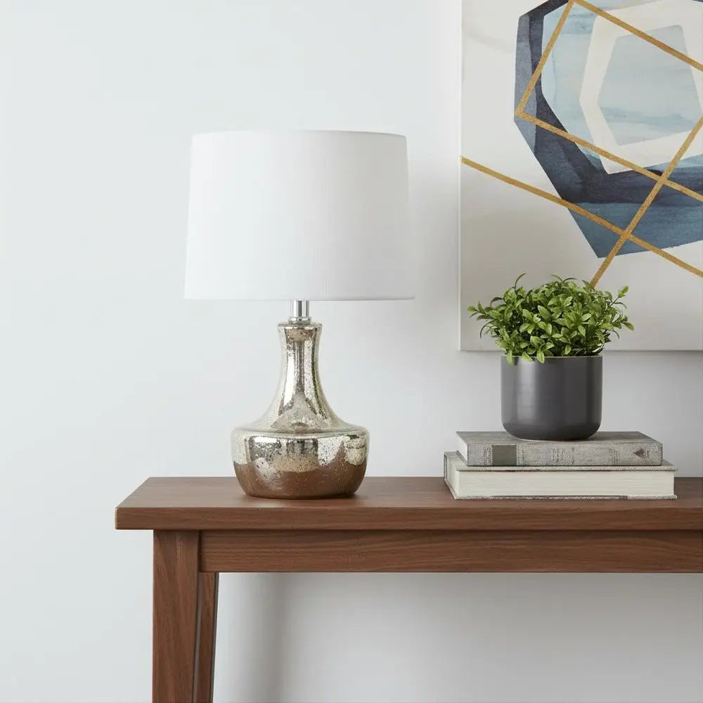 This 20-inch silver novelty desk lamp led with drum shade is a great way to add some brightness to any corner of your home. The base of this lamp is made of iron finished in a silver tone. The white drum linen shade is a great compliment to this lamp. This desk lamp provides 'task lighting' that will illuminate your working area for reading or writing. Use this lamp anywhere and elevate the look of the whole space. It is perfect for virtually any decor. 20.00-inch h x 10.00-inch w x 10.00-inch d.