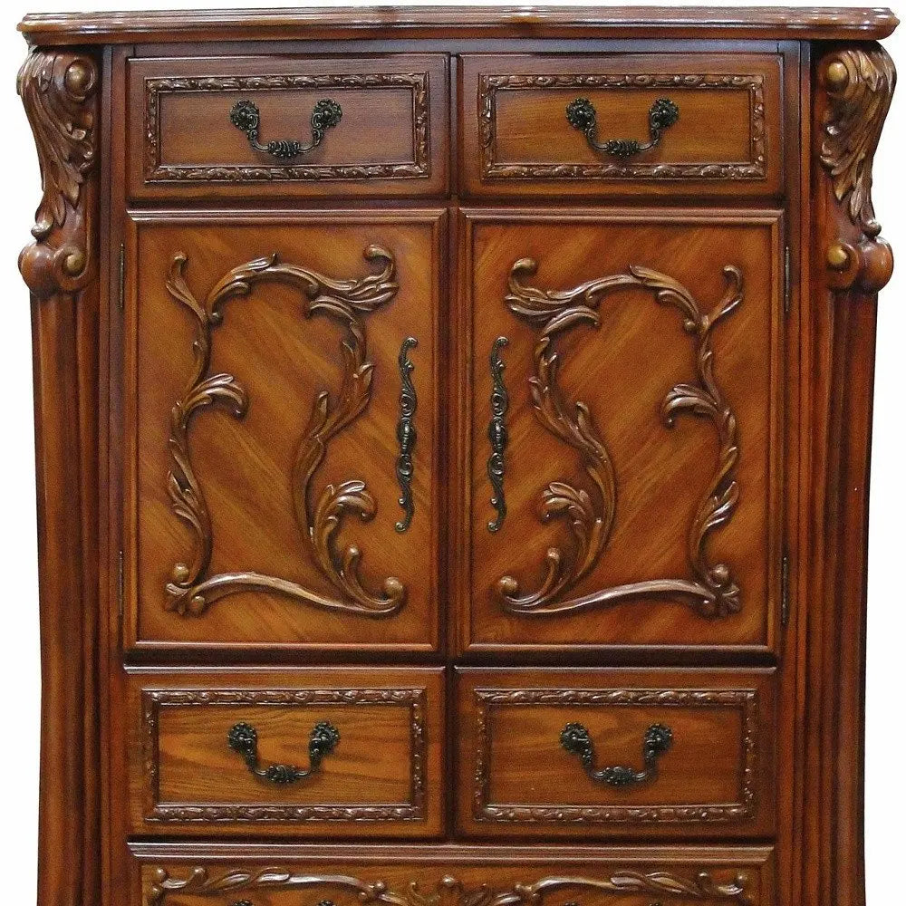 This Dresser/Server is crafted with the finest solid woods with veneers in cherry oak finish. This Collection is enhanced by remarkable marquetry and generously carved wood elements. The case goods feature solid hardwood with five drawers and two door with shelf for storage with coordinating carvings. The drawers feature dovetail construction and are decorated with antique brass hardware. This beautiful Dresden Bedroom Collection will add magnificence to your bedroom!