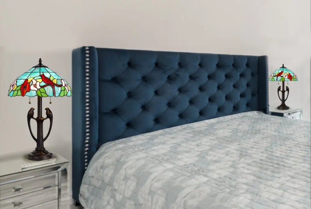 22" Bronze Two Light Tiffany Table Lamp With Aqua and Red Floral Shade