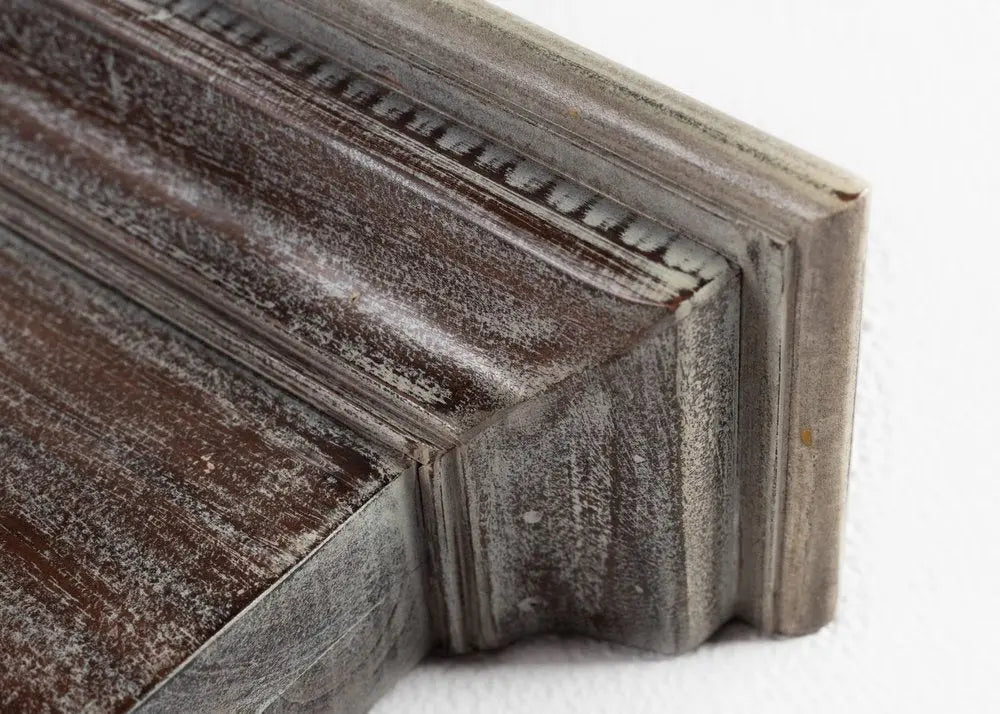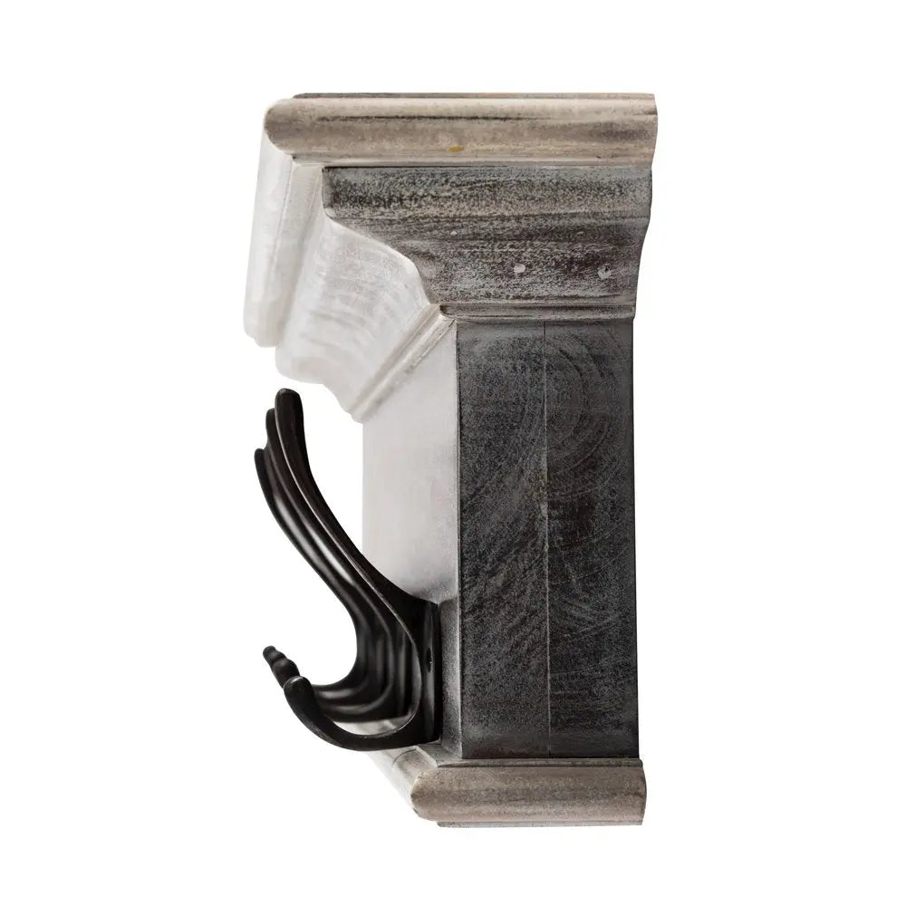 The four hook 28-inch brown solid wood wall mount coat rack is the perfect blend of functionality and style for your living room. This wall-mounted coat rack features a rustic design that enhances any space with its warmth and charm. Handcrafted from mahogany wood, with four large antiqued brass hooks, the rack has a whitewashed finish over the natural wood. Creatively fashioned to include a small shelf, the top of the rack has just the right amount of space to display decorative artifacts or even small plants. Crown moldings adorn the top of the shelf to complete the traditional look of this rack. The large multipurpose hooks are built to support anything from keys and coats to handbags as well. 7.87-inch h x 27.56-inch w x 3.94-inch d.