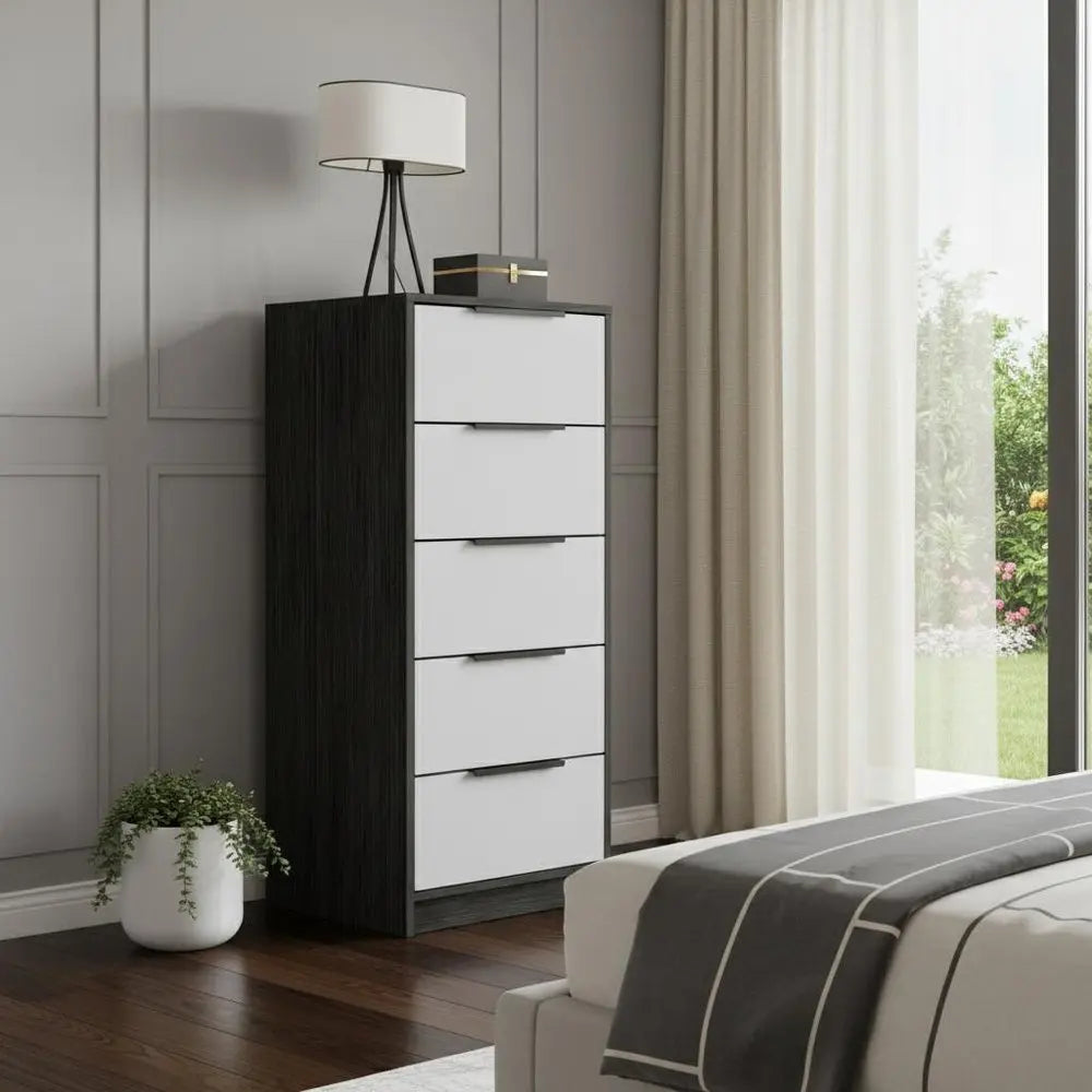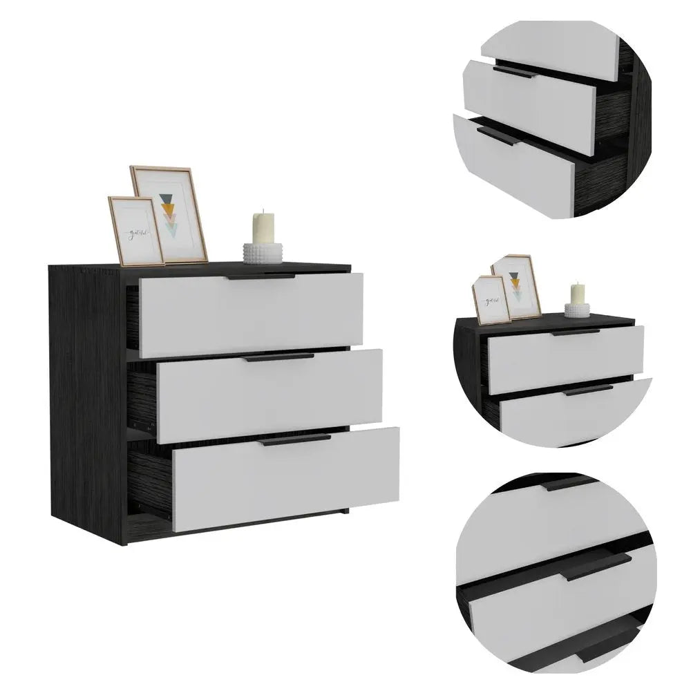 Make your room functional and visually enticing with this masterful 28" white and smokey oak manufactured wood three drawer standard dresser. This horizontal standard dresser has column style drawers and a wide top surface area to help you with your daily dressing essentials. Equipped with three easy open drawers for practical and good looking clothing storage. Its a high quality piece, made from high grade manufactured wood. 27" H x 27.6" W x 16.5" D