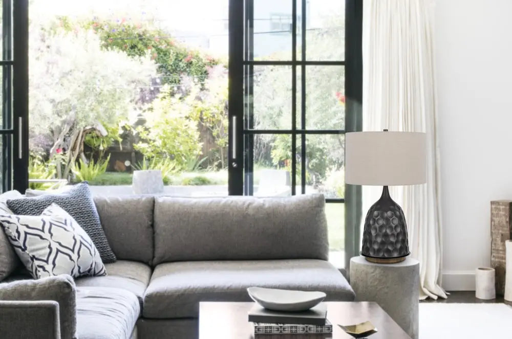 29" Gray Metal Table Lamp With Brown Drum Shade