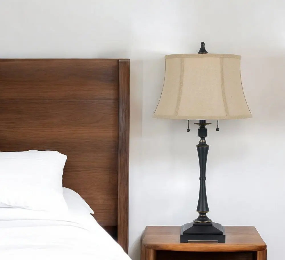 31" Black Metal Two Light Candlestick Table Lamp With Beige Empire Shade