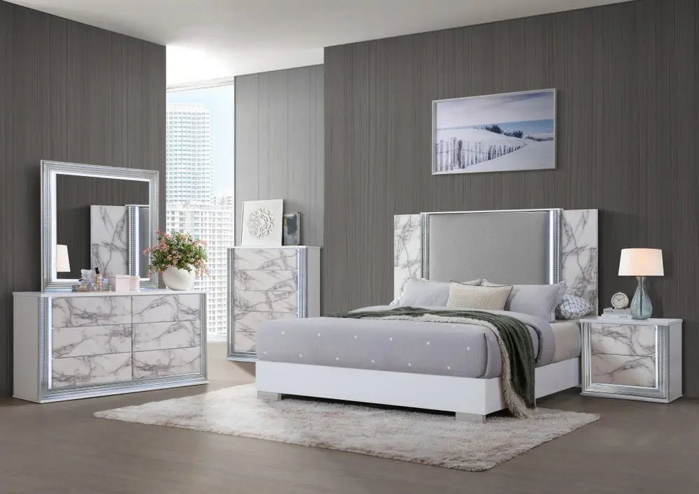 49" Silver And White Wood Faux Marble Lighted Five Drawer Dresser
