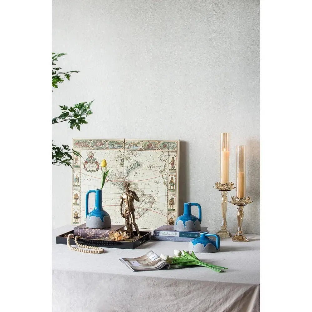 Add a touch of transitional charm to your space with this 7-inch ceramic jug vase featuring a unique bud shape. The blue and gray hues blend seamlessly for a soothing color palette. The coat/paint distressing adds a purposeful vintage touch, perfect for creating a cozy atmosphere in any room. Crafted from high-quality ceramic, this vase exudes elegance and durability. The jug vase design offers a classic yet stylish look that complements various decor styles. Display this vase on its own as a decorative piece or fill it with your favorite blooms for a fresh pop of color. 6.5-inch h x 6.3-inch w x 6.3-inch d.