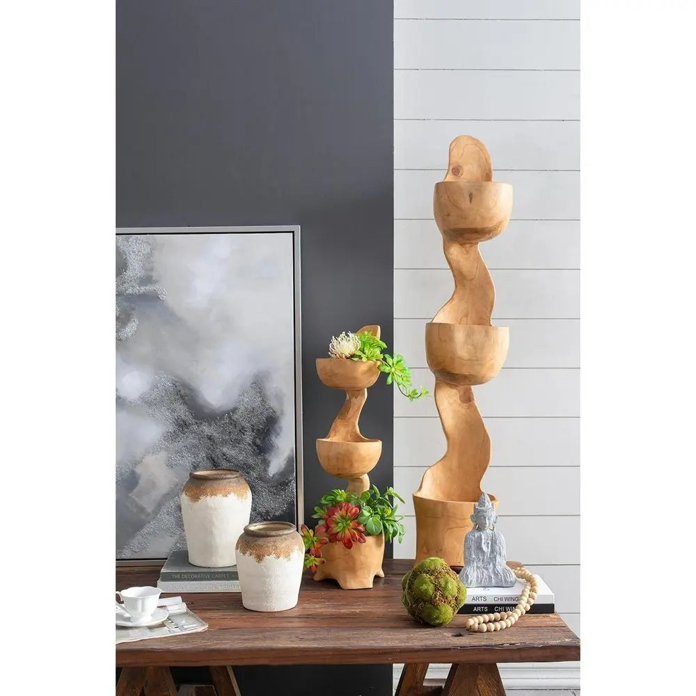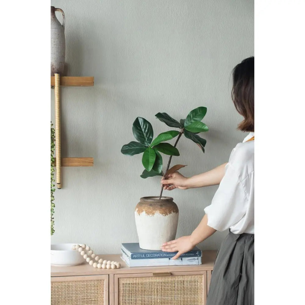 Enhance your home decor with this elegant 8-inch ivory and brown ceramic round jug vase, hand-painted to perfection. The unique jug vase shape adds a touch of charm to any room. Crafted from high-quality ceramic material, this vase boasts a bohemian style that complements a variety of interior design aesthetics. The purposeful distressing with a coat/paint finish gives it an antique allure, perfect for adding character to your space. Display fresh or faux flowers in this vase to create a stunning focal point in your living room, bedroom, or dining area. Add a sophisticated touch to your home with this exquisite piece. 7.9-inch h x 7.3-inch w x 7.3-inch d.