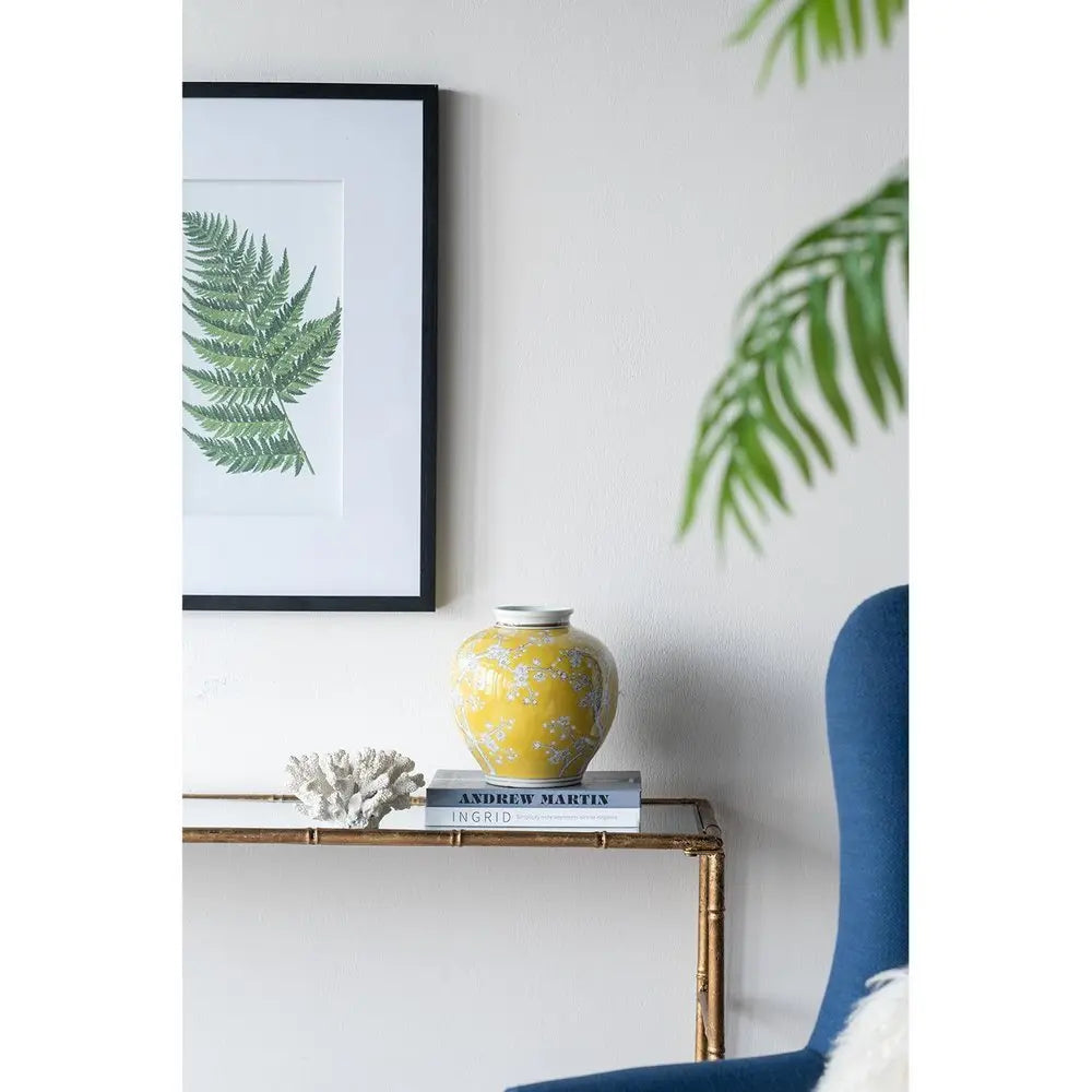 The 9-inch yellow and white floral round porcelain table vase is a stunning addition to any interior space. Crafted from high-quality porcelain, this table vase showcases a round shape that complements a variety of decor styles. Its traditional design is enhanced by exquisite hand-painted floral patterns, creating a beautiful focal point for your tabletop. Ideal for holding fresh or artificial flowers, this vase adds a touch of elegance to your home. Perfect for a living room, dining room, or entryway, it effortlessly elevates your decor while reflecting your personal style. Use it as a standalone piece or mix and match with other decor items to create a harmonious arrangement. 9.1-inch h x 8.7-inch w x 8.7-inch d.