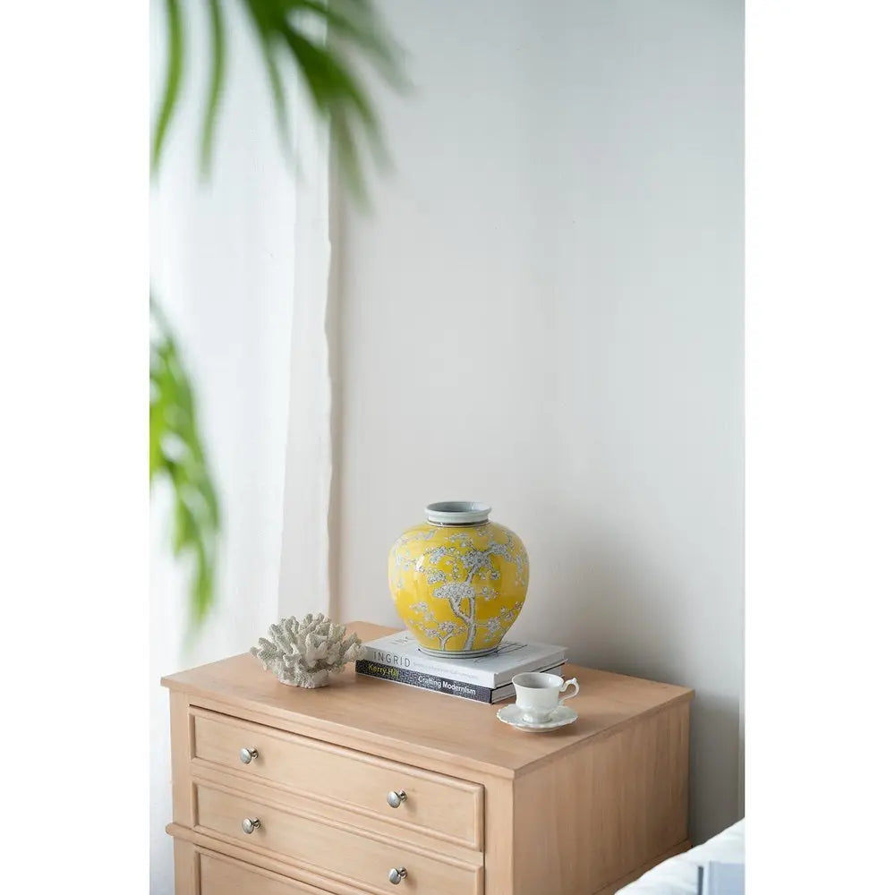 9" Yellow And White Floral Round Porcelain Table Vase - NOBLE HOME INTERIORS