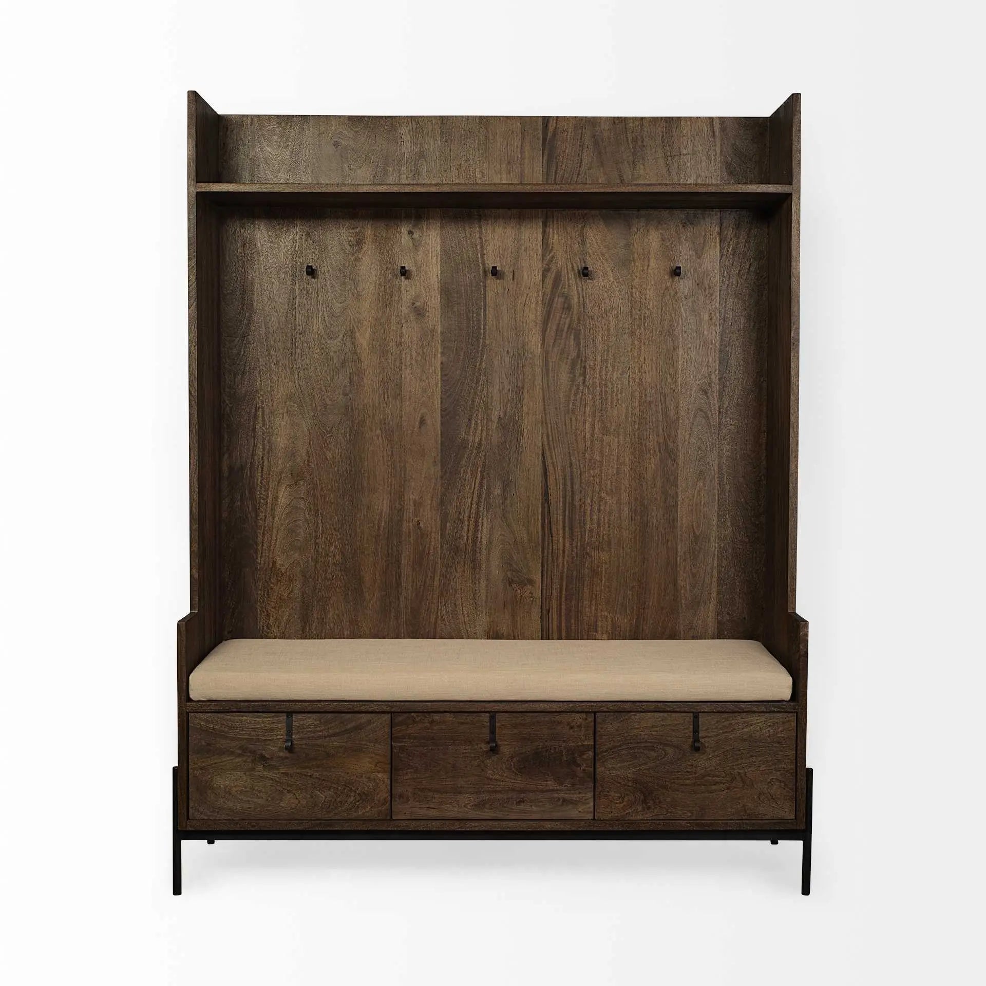 The brown wood cream fabric wrapped seat hall tree with storage is a stylish addition to your entryway. Featuring a modern design, this coat rack seamlessly blends functionality with elegance. Equipped with five hooks, it provides ample space for hanging coats, scarves, and bags. The rich brown color adds warmth and sophistication to any decor, while the cream fabric-wrapped seat offers a comfortable spot for putting on or taking off shoes. With integrated storage, it helps keep your space organized and clutter-free, making it perfect for busy households. This versatile piece not only enhances your home's aesthetics but also serves as a practical solution for everyday needs, ensuring you step out in style every time. 70-inch h x 16-inch w x 55.5-inch d.