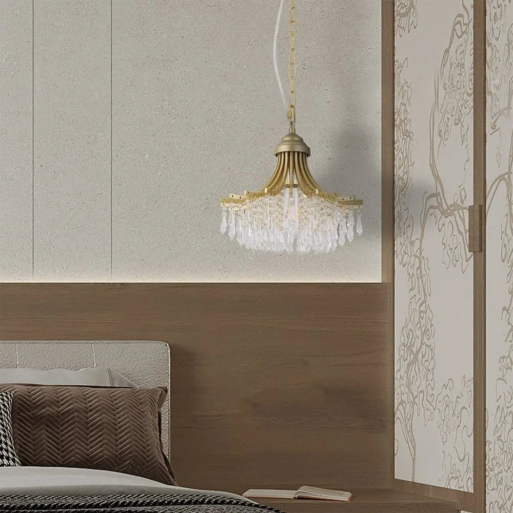 Dress up your entryway, dining room, kitchen, or bedroom with this clear and gold metal and crystals chandelier with clear shade. With its clear and gold finish, this light fixtue oozes with rich charm. Get creative and change up the look of any room from hallway, to closet, to office or bedroom with this gorgeous hanging chandelier light fixture. 10-inch h x 11.75-inch w x 11.75-inch d.