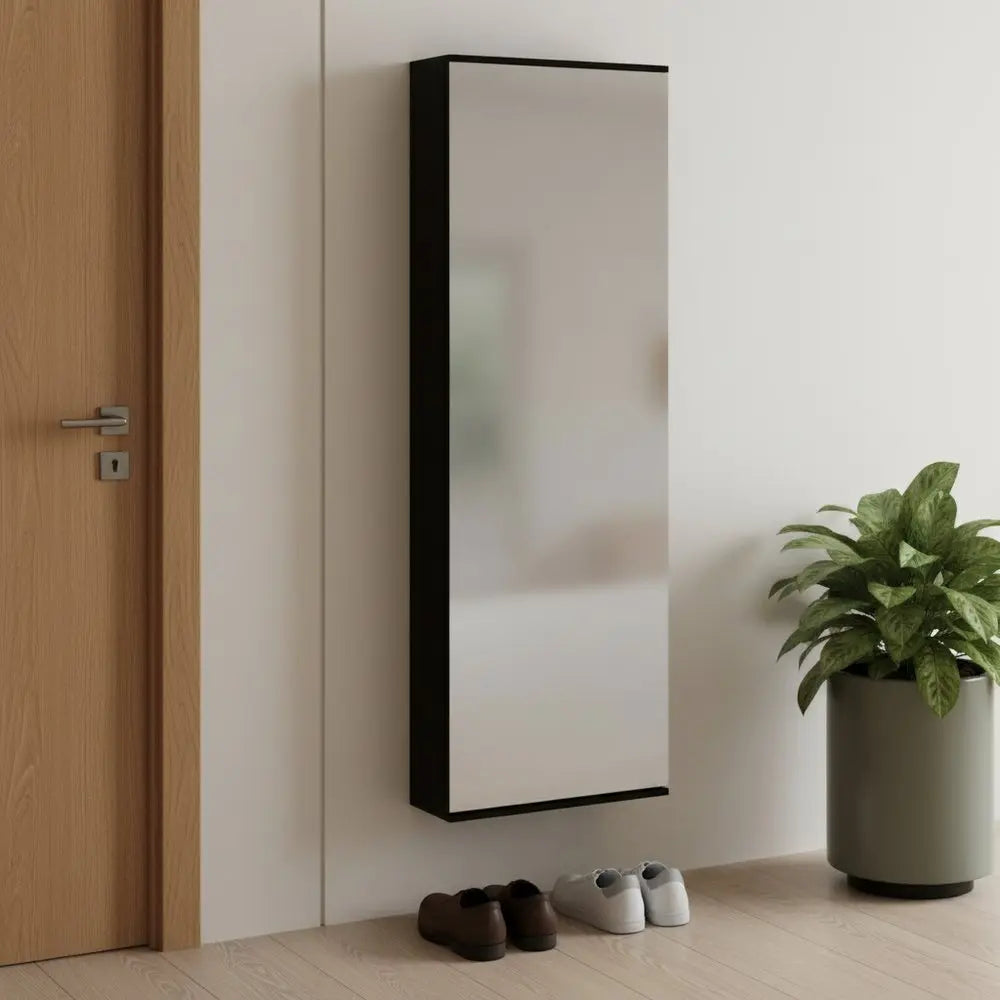 Set your home up for success and tidiness with this Stylish Black Wengue Particle Board Wall Mounted Shoe Rack with Mirror. This practical storage unit is made of quality-grade particle board material, providing you with a sturdy piece that can withstand the test of time in your home. Due to the wall mounting feature, this rack is a perfect space saver, and is a great extra storage solution for any room. The storage capacity of this rack is up to ten pair of shoes. The beautiful design with a solid black color elevates the unit's sleek and stylish aesthetic. This unit is the perfect solution for a clean and organized home. 54.3" x 18.5" x 8.1"