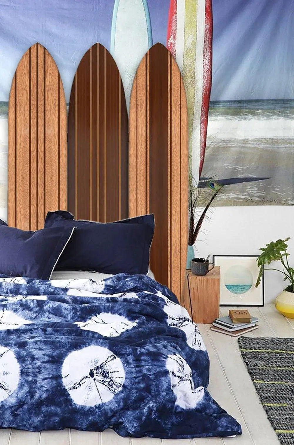 Enjoy this Natural Brown Wood Long Board Screen. Live the coastal lifestyle with your very own screen shaped into three 3 surfboards hinged together. Natural variations and colors in the wood board make for a unique piece that will be sure to drop jaws. Inspired by traditional wooden surfboards. 47" x 1" x 71"